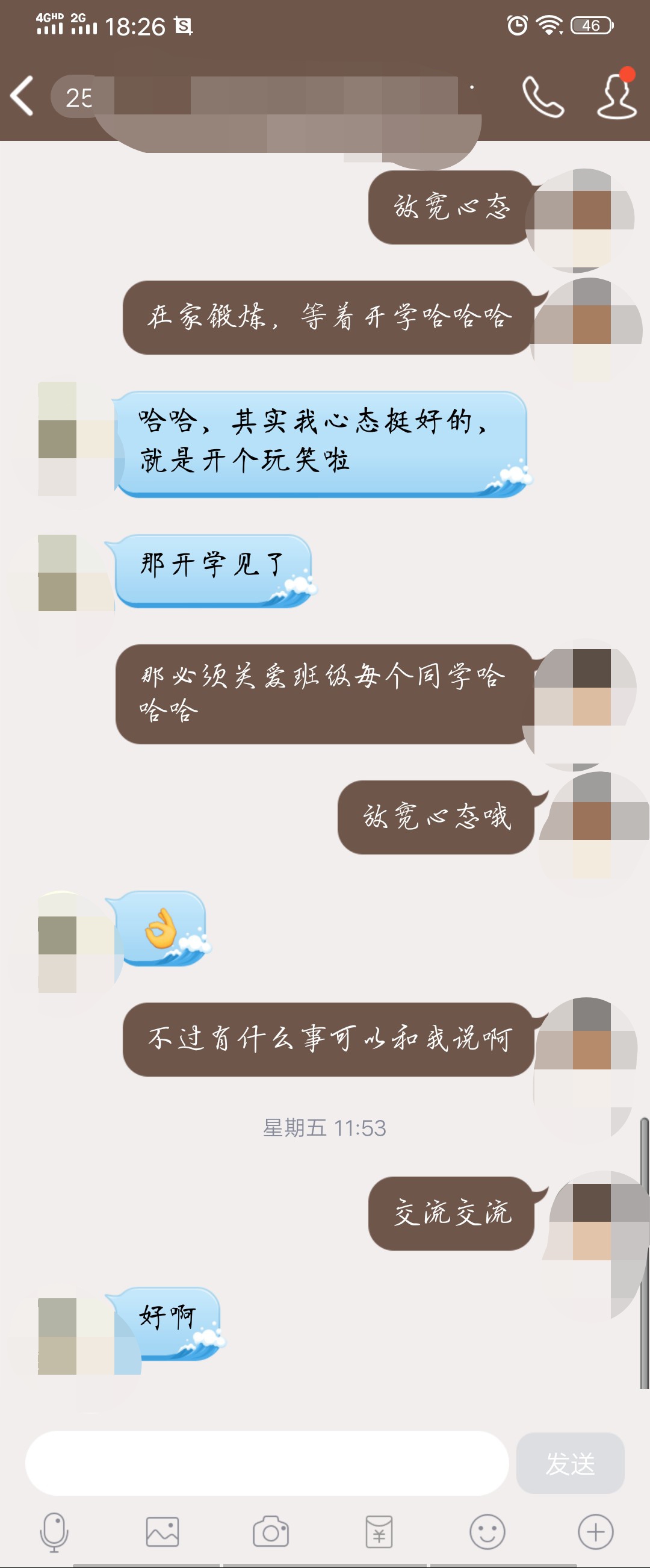 四、可能部分同学周边可能有确诊的病例因此而感到焦虑和恐慌,这时候我们的心理委员也在积极疏导同学们的心理,帮助他们消除恐惧以正确的态度面对这次疫情!