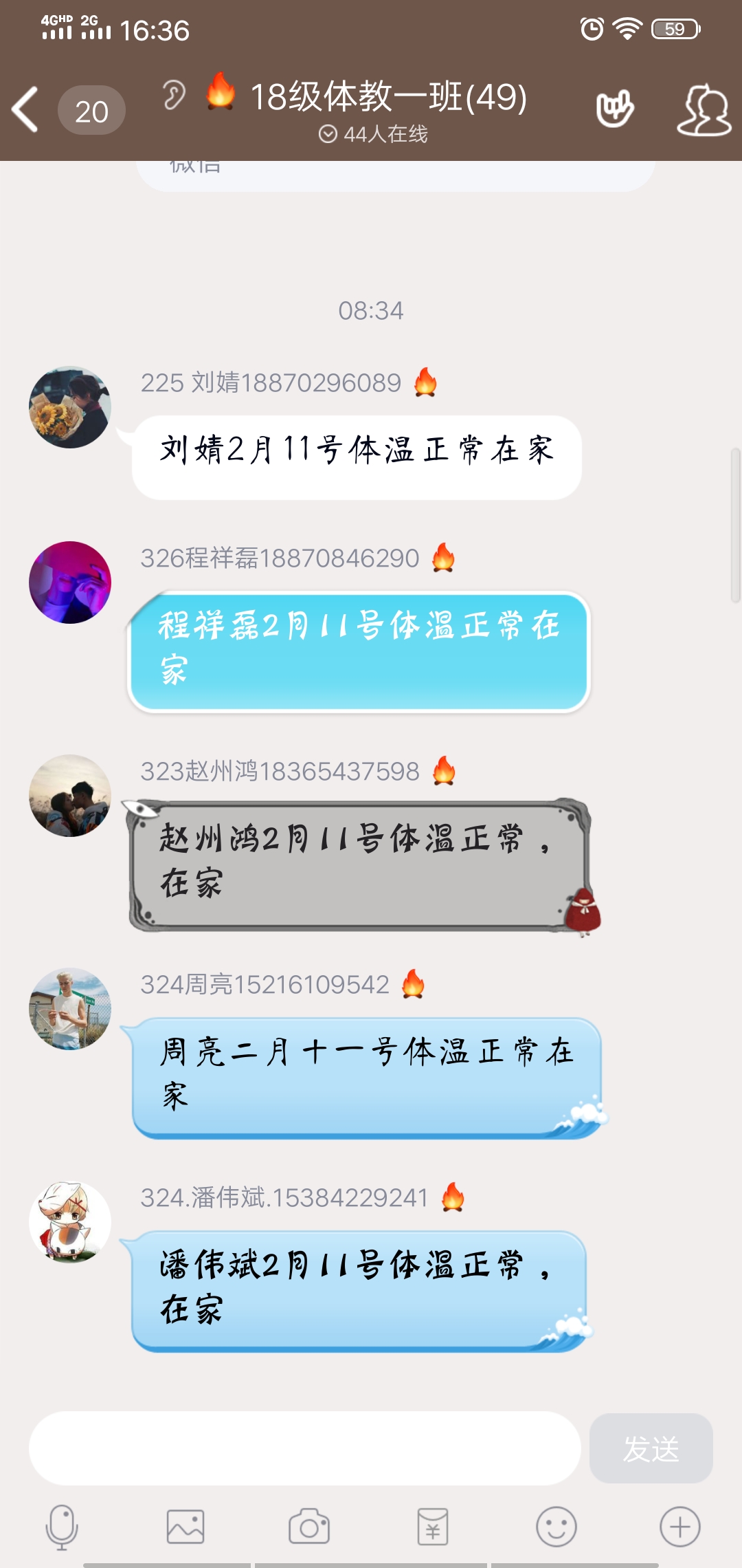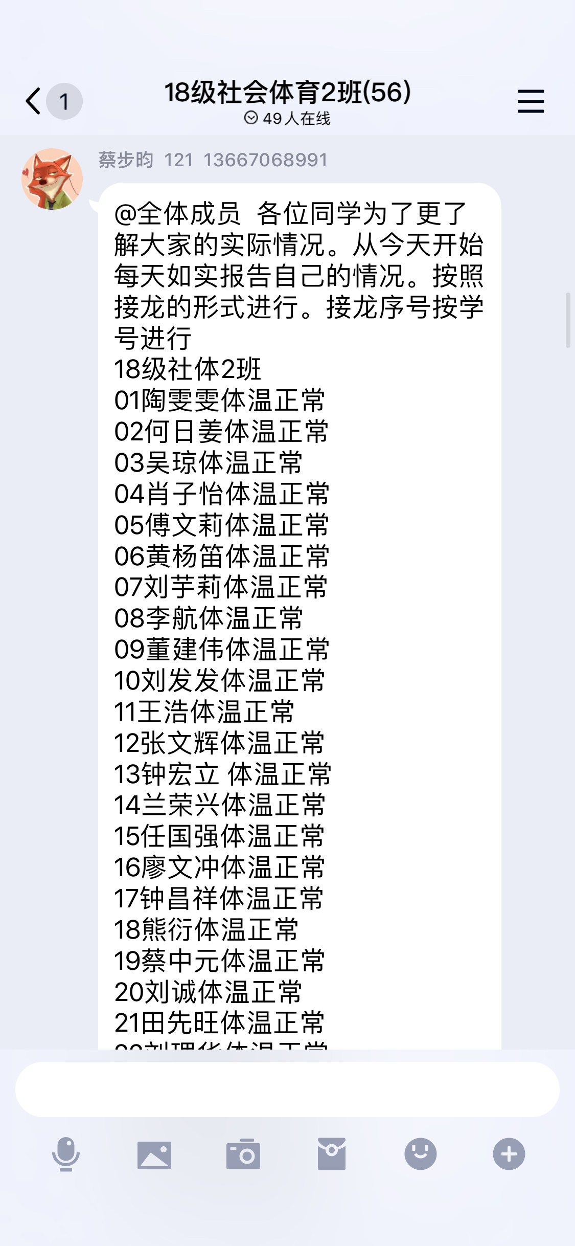 二、各班级要求同学们每日对自身的身体情况以及体温进行汇报,这样我们可以得知同学们的身心健康能够更好的了解同学们在家情况!
