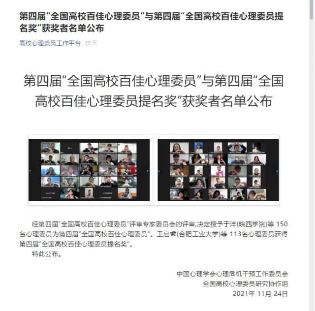 1118第十届全国高校心理委员工作研讨会与朋辈心理辅导论坛在线上召开会议深入总结和推广展示各高校优秀心理委员工作经验,提供了全国高校先进工作经验的交流和借鉴的平台会议公布并表彰了第“全国百佳心理委员”获评人员PA视讯平台19体育教育2马江龙在数百名提名朋辈心理委员中脱颖而出,入选第二届“全国百佳心理委员”。