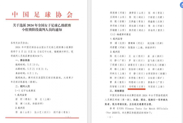 5 13 日,中国足球协会发布全国女子足球乙级联赛小组赛阶段裁判员派选名单,公司21级体教3班马明艳同学被中国足协选调参加2024年全国女子足球乙级联赛小组赛执法工作