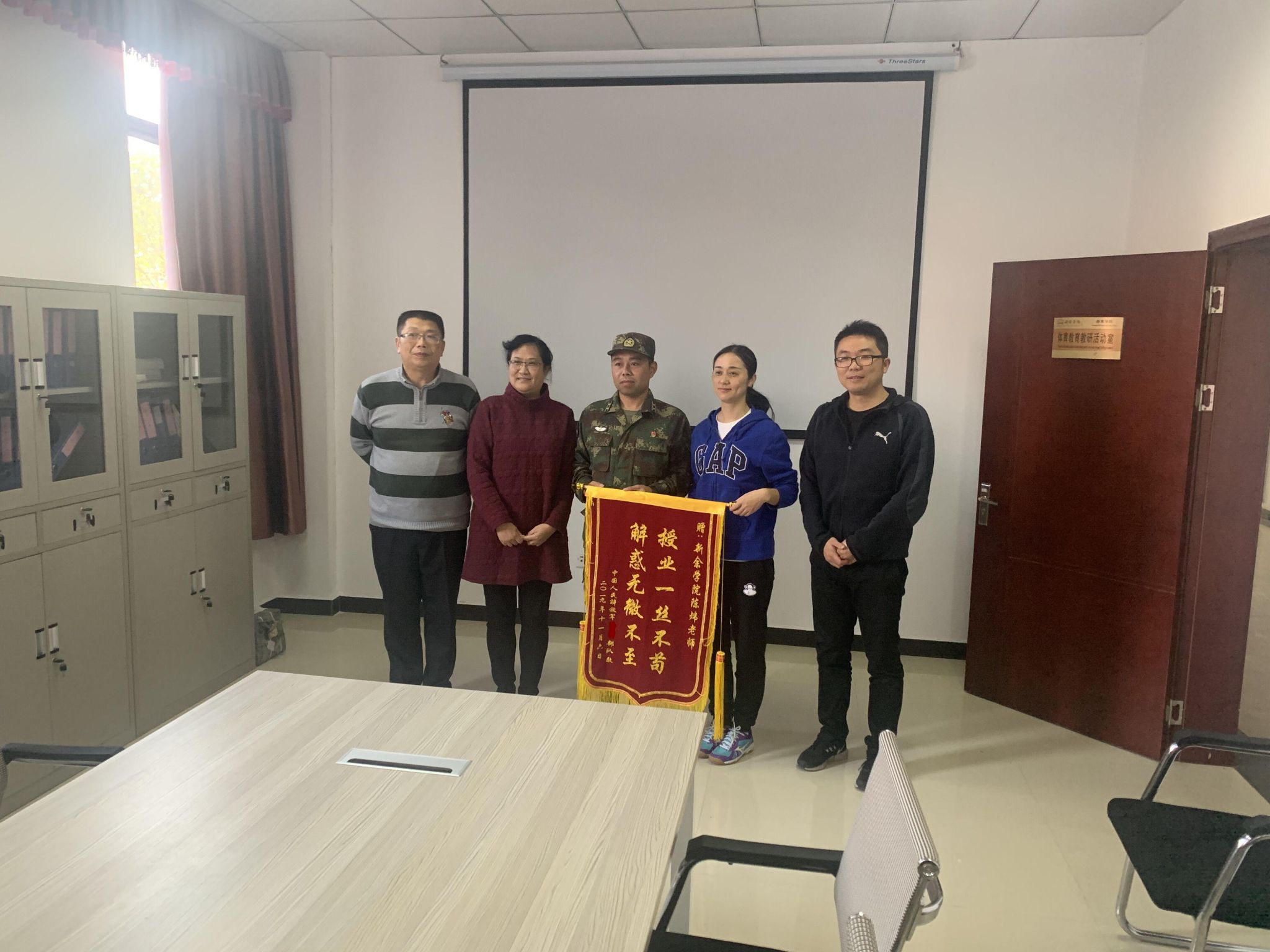 11月8日,火箭军驻新余部队一行四人来到PA视讯平台,将一面“授业一丝不苟,解惑无微不至”的锦旗送到PA视讯平台教师陈炜手中,表达火箭军官兵对陈炜老师在近两个月武术培训过程中尽心尽责指导的深深谢意。