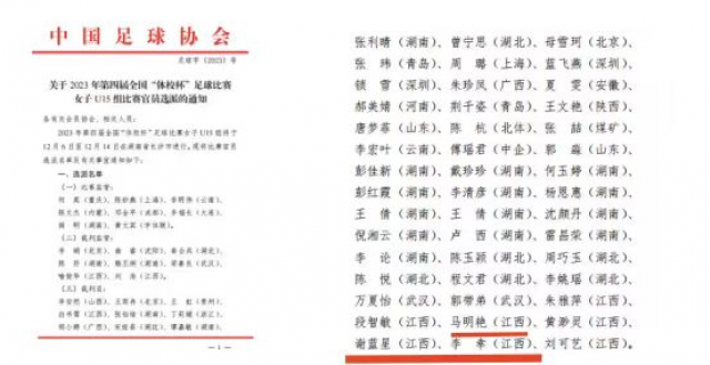 我院21级体教3班马明艳、谢蓝星、李幸3名同学被中国足协选调参加 2023 年第四届全国“体校杯”足球(女子组)比赛执法工作,本次江西省共选派8名裁判,公司占3名,值得一提的是,这是我院同学首次被中国足协选调参加全国赛事。本次比赛由国家体育总局青少年体育司和中国足球协会主办,12 月 6 日至 12 月 14 日在湖南长沙隆重举行。