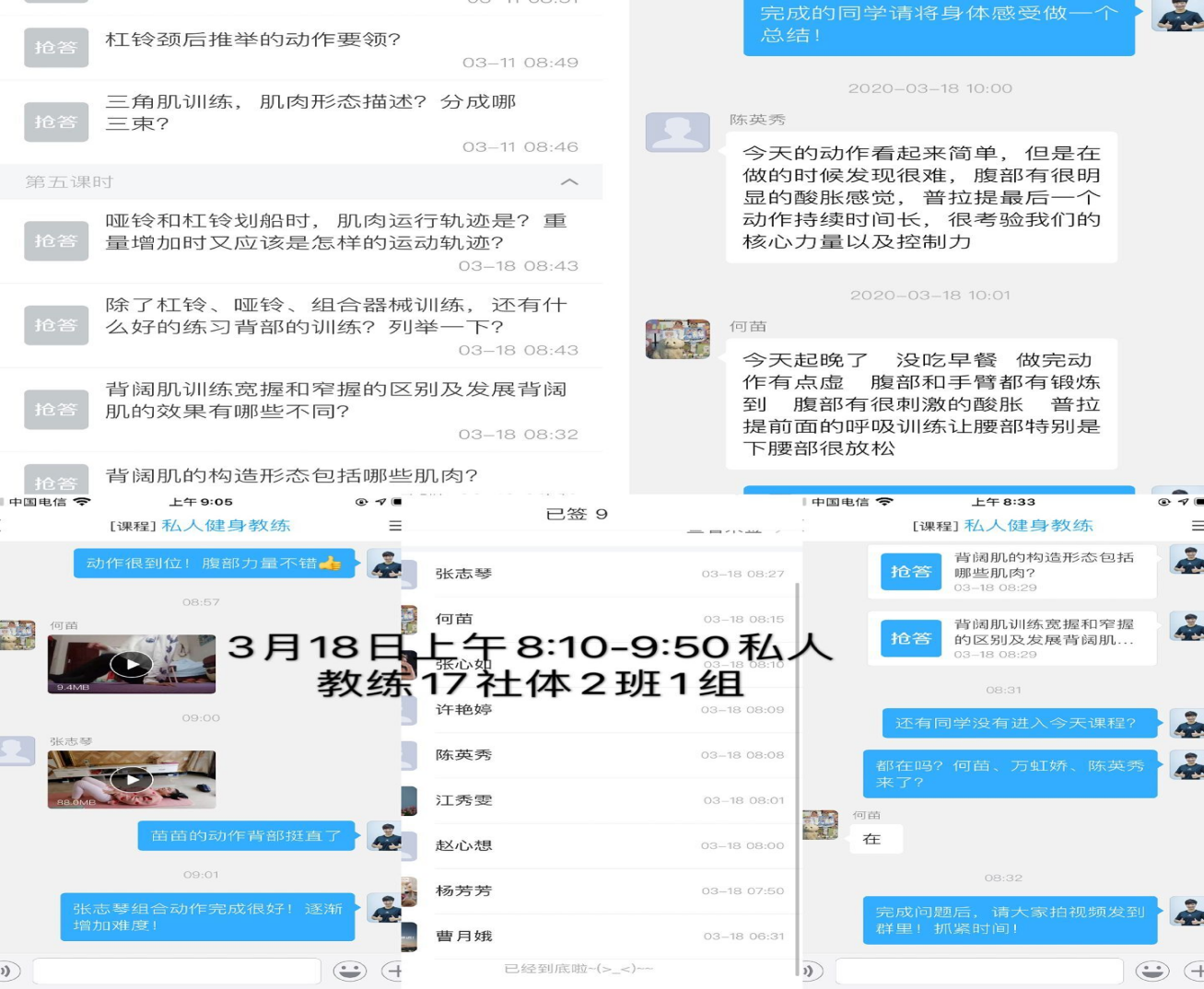 专业体育课由于特殊性,需要一定的场地,器械,教师的示范和纠错,员工的练习,互动性要求较高。部分课程要求员工自制器械,录好视频上课来讲解点评,起到较好的效果。如图,18社会体育指导与管理班员工在学习《私人教练》课程中利用家中的生活物品自制健身器械,同样起到健身房器械健身的效果。18体育教育员工足球课通过动作练习录制视频给老师进行反复检查和纠错,对提高教学质量起到了良好的作用。