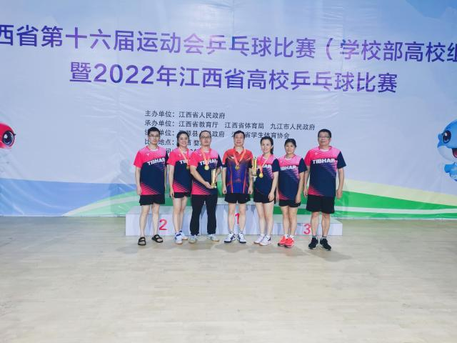 9月2日至6日,由江西省人民政府主办,江西省教育厅、江西省体育局、九江市人民政府承办的江西省第十六届运动会(公司部高校组)乒乓球比赛在上饶市婺源县体育中心体育馆举行。公司乒乓球队经过5天激烈的角逐在2022年江西省第十六届运动会乒乓球比赛(高校教工组)获得女子团体冠军,邹薇、陈瑛老师获得女双冠军,陈瑛老师获得女单亚军,男双亚军,混双亚军的佳绩完美收官。