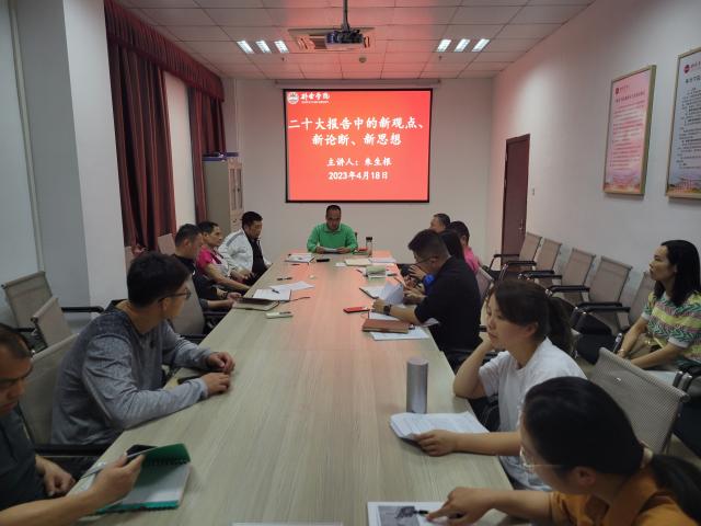 418日,教工党支部书记朱生根以“二十大报告中的新观点、新论断、新思想”为题,介绍了党的二十大提出的一系列新观点、新论断、新思想,带领大家从大会主题中深刻理解党和国家事业发展的总纲,从党的中心任务中深刻把握新时代中国共产党人强烈的历史自觉和责任担当,从中国式现代化中深刻体会中国共产党人的历史自信,从三个务必、三件大事、第二个答案等系列观点中深刻感悟党的二十大报告这一马克思主义纲领性文献的丰富内涵。